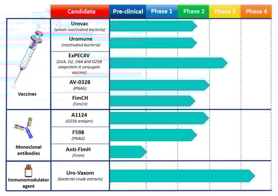 Human vaccines and monoclonal antibodies (mAbs) used to fight E. coli infections. The candidate section describes the trademarks and the specific targeted antigens. Pre-clinical as well as each clinical phase are represented. Arrows reaching dotted line indicate a completed study for that phase, conversely, studies are ongoing.