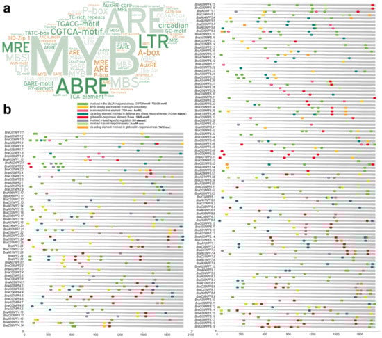 Transcription factors bind to CREs in the promoter and regulate the expression of the target genes []. Generally, genes with similar CREs show the same expression patterns. The 2.0-kb upstream regulatory regions of the BnaNPF genes were used to explore the CREs (Figure 2 and Table S4). The results show that 157 BnaNPF genes contained at least one type of CRE in the promoter regions, which indicated that complex transcriptional regulation might be implicated for BnaNPF genes. Apart from the common CREs, such as the CAAT-box, TATA-box and some light-responsive elements (G-box, Box 4, GT1-motif and TCT-motif), some phytohormone-responsive elements, such as the auxin-responsive elements (TGA-element, AuxRR-core, GATA-box, TGA-box and AuxRE), the ABA-responsive element (ABRE) and the JA-responsive elements (CGTCA-motif and TGACG-motif), and some abiotic stress-responsive elements, such as the low-temperature-responsive element (LTR), the salicylic acid-responsive element (TCA-element) and the anaerobic-responsive element (ARE), were identified. Some over-presented CREs, including ARE, ABRE, CGTCA-motif, TGACG-motif, LTR and TC-rich repeats, were involved in the molecular response of plants to phytohormone, defense and stress responsiveness (Figure 2a). Among these, the MYB recognition site was most enriched, implying that the MYB transcript factors may play crucial roles in the transcriptional regulation of the BnaNPF genes. Besides, RY-element, the CRE involved in seed-specific regulation, was identified in the promoters of the 15 BnaNPF genes, which indicated that these BnaNPF genes might function in the process of seed development and matter storage.
