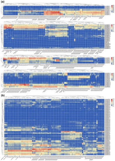 In order to explore the potential tissues in which NPF genes function in B. napus, the expression profiles were characterized in 90 different organs or tissues, including cotyledon, root, vegetative rosette, stem peel (peel of upper, middle and lower stem), leaf (23 parts or periods), sepal, petal, filament, pollen, bud, silique wall (30 development periods) and seed (24 development periods) based on transcriptome information from BnTIR (http://yanglab.hzau.edu.cn/BnTIR/eFP, Accessed on 4 May 2021). Except for half of the genes in the BnaNPF2, BnaNPF5 and BnaNPF8 subfamily that has relatively low expression values (FPKM < 1) or no expression, most of the BnaNPF genes had preferential expression profiles in the 90 tissues (Figure 3). For instance, half of the BnaNPF1 genes showed high expression levels in the silique wall at the early and middle development stages and in leaves of all parts; one-third of BnaNPF2 genes (10/30) showed specific expression in the seeds at early and middle development stages; most of the BnaNPF7 genes (8/10) were highly expressed in the bud, petal, pollen and seeds. In general, expression patterns were conserved in each clade within a subfamily, but were quite different across different subfamilies, suggesting the expression differentiation trend of this gene family. For instance, expression patterns of BnaNPF2 and BnaNPF4 subfamilies were classified into three conserved patterns that were consistent with the three major clades in these two subfamilies, and while the expression profile of the BnaNPF3 genes was similar in this subfamily.
