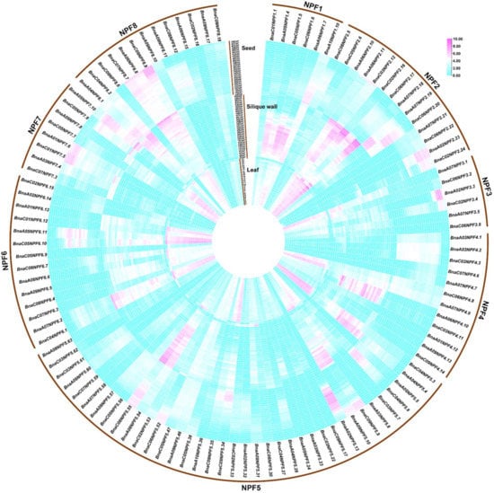 Gene expression patterns provided imperative clues to map out gene functionality. In this study, the expression level of BnaNPF genes was investigated in diverse tissues or organs of B. napus using the released transcriptome information resource (http://yanglab.hzau.edu.cn/BnTIR/eFP, Accessed on 4 May 2021). Gene expression analysis showed that BnaNPF genes have significantly different and complex expression patterns across different subfamilies, but the expression pattern was conserved in each clade within a subfamily, which reflected structure and function uniform (Figure 3). Some BnaNPF genes showed obvious tissue preferential expression. Half of the BnaNPF1 genes having ultrahigh expression levels in silique wall at the early and middle development stages of silique indicated efficient nitrogen transport for nutrient synthesis in the seed. BnaA07NPF2.18, orthologous to AtNPF2.13/NRT1.7 that was able to transport nitrate, glucosinolates, JAs and GAs [,], was expressed at an ultrahigh expression level in the bud, pollen, filament and petal, which contribute to the previous reports that nitrate and nitrogen regulated flowering, and high nitrate/nitrogen helped promote flowering [], and phytohormone played an important role in the regulation of flower organogenesis [,].