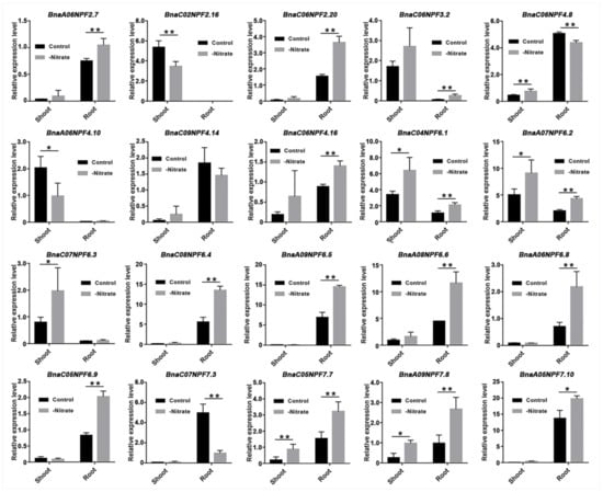 The expression changes detected for 20 BnaNPF genes under the condition of nitrogen suitability and deficiency. “Control” and “-Nitrate” represent treatments under nitrogen suitability and deficiency, respectively. “*”and “**” represent the significance level of 0.05 and 0.01, respectively.