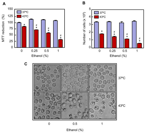 Effect of ethanol on cell viability in U937 cells exposed to hyperthermia. The cells were pre-incubated in absence or presence of the indicated concentrations of ethanol for 30 min, exposed to hyperthermia (30 min at 43 °C) and allowed to recover for 24 h. (A) Mitochondrial activity was evaluated by the MTT reduction assay. (B) The number of viable cells was determined by the trypan blue exclusion method using an automatic cell counter. (C) The cells were visualized under phase contrast microscopy; a representative field of each experimental group is shown. Magnification 20×. * p < 0.05 vs. respective control at 37 °C; # p < 0.05 vs. hyperthermia (43 °C) treatment alone.