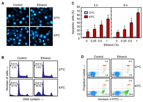 Effect of ethanol on apoptotic cell death in U937 cells subjected to hyperthermia. (A) The cells were pre-incubated in absence or presence of 0.5% ethanol for 30 min, exposed to hyperthermia (30 min at 43 °C) and allowed to recover for 24 h. The cells were collected, stained with bisbenzimide trihydrochloride and nuclei visualized by fluorescent microscopy; photomicrographs of representative fields of cells to evaluate nuclear chromatin condensation (i.e., apoptosis) are shown. Magnification 40×. (B) The cells were pre-incubated in absence or presence of 0.5% ethanol for 30 min, exposed to hyperthermia (30 min at 43 °C) and allowed to recover for 8 h. The cells were harvested and cell distribution, according to their DNA content, was determined by flow cytometry using the propidium iodide staining procedure; the position of cells with sub-G1 DNA content (i.e., apoptotic cells) is indicated by a dotted line. Representative histograms are shown. (C) The cells were pre-incubated in absence or presence of the indicated concentrations of ethanol and allowed to recover for the indicated period of time. The cells were collected, and the percentage of apoptotic cells was determined by flow cytometry as above. (D) The cells were pre-incubated in absence or presence of 0.5% ethanol for 30 min, exposed to hyperthermia (30 min at 43 °C) and allowed to recover for 3 h. The cells were collected, stained with propidium iodide and annexin V-FITC and analyzed by flow cytometry. * p < 0.05 vs. respective control at 37 °C; # p < 0.05 vs. hyperthermia (43 °C) treatment alone.