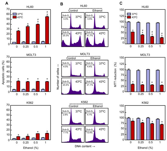 Effect of ethanol on apoptotic cell death in human leukemia cell lines subjected to hyperthermia. The cells were pre-incubated in absence or presence of ethanol for 30 min, exposed to hyperthermia (30 min at 43 °C), and allowed to recover for the indicated period of time. (A) The cells were collected after a 3 h period of recovery and cell distribution according to their DNA content was determined by flow cytometry, using the propidium iodide staining procedure; percentage of apoptotic cells (i.e., fraction of cells with sub-G1 DNA content) is shown. (B) The cells were allowed to recover for 3 h and cell distribution according to their DNA content was determined by flow cytometry, as above; the position of apoptotic cells is indicated by a dotted line. Representative histograms are shown. (C) The cells were collected following a 24 h period of recovery and cytotoxicity evaluated by the MTT reduction method. * p < 0.05 vs. the respective control at 37 °C; # p < 0.05 vs. hyperthermia (43 °C) treatment alone.