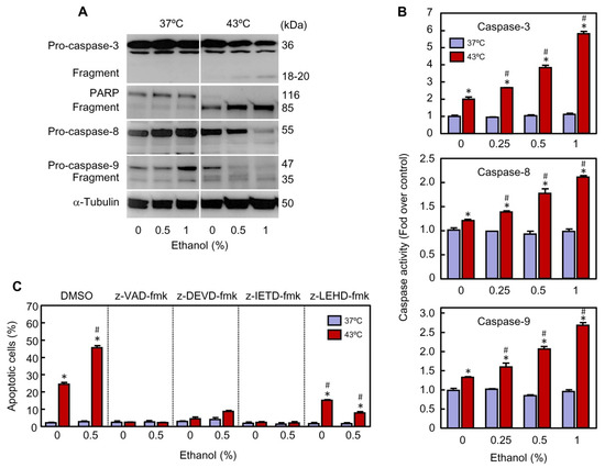 Effect of ethanol on processing and activity of caspases in U937 cells subjected to hyperthermia. (A–C) The cells were pre-incubated in absence or presence of the indicated concentrations of ethanol for 30 min, exposed to hyperthermia (30 min at 43 °C) and allowed to recover for 3 h. (A) Cleavage of indicated pro-caspases was analyzed by immunoblotting; as a loading control α-tubulin was also determined. (B) The activity of specified caspases was determined from lysates using colorimetric substrates and results are expressed as fold increase in caspase activity compared with the respective control. (C) Effect of cell-permeable caspase inhibitors on modulation of apoptosis by ethanol in cells subjected to hyperthermia. The cells were pre-treated for 1 h in absence (vehicle, 0.1% DMSO) or presence of 100 μM of z-VAD-fmk (broad-spectrum caspase inhibitor), 50 μM z-DEVD-fmk (caspase-3 inhibitor), 50 μM z-IETD-fmk (caspase-8 inhibitor), or 50 μM z-LEHD-fmk (caspase-9 inhibitor), exposed to hyperthermia with or without ethanol, collected after the time period of recovery, and analyzed by flow cytometry using the propidium iodide staining method.* p < 0.05 vs. the respective control at 37 °C; # p < 0.05 vs. hyperthermia treatment alone (containing DMSO) or hyperthermia plus ethanol (containing DMSO).