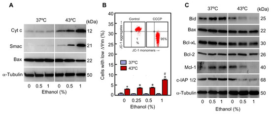 Effect of ethanol on pro-apoptotic and anti-apoptotic factors involved in the mitochondrial pathway of apoptosis in U937 cells subjected to hyperthermia. (A–C) The cells were pre-incubated in absence or presence of the indicated concentrations of ethanol for 30 min, exposed to hyperthermia (30 min at 43 °C) and allowed to recover for 3 h. (A) Cytosolic fractions were isolated and analyzed by immunoblotting; α-tubulin was used as a loading control. (B) Mitochondrial transmembrane potential (∆ψm) was evaluated by flow cytometry using the JC-1 probe (10 µM) and expressed as percentage of cells with low mitochondrial transmembrane potential (low green fluorescence); cells treated with 50 μM of CCCP for 30 min were used as a positive control (inserted dot plot). (C) Whole cell lysates were prepared and assayed by immunoblotting; as a loading control, α-tubulin was also determined. * p < 0.05 vs. the respective control at 37 °C; # p < 0.05 vs. hyperthermia (43 °C) treatment alone.