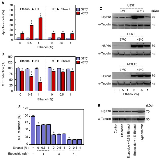 Impact of the moment of ethanol addition on modulation of cell death triggered by hyperthermia (HT) and role of HSP70. (A,B) U937 cells were treated with the indicated concentrations of ethanol before (Ethanol ► HT, left panel) or after (HT ► Ethanol, right panel) they were immersed for 30 min in a water bath at 37 °C or 43 °C, as indicated. (A) The cells were incubated at 37 ºC for 3 h of recovery and the percentage of apoptotic cells determined by flow cytometry using the propidium iodide staining procedure. (B) The cells were incubated at 37 °C for 24 h of recovery and the mitochondrial activity determined at 570 nm by the MTT reduction assay using a microplate reader. (C) The cells were exposed to hyperthermia (30 min at 43 °C) in presence of the indicated concentrations of ethanol and allowed to recover at 37 °C for 3 h (U937) or 8 h (HL60 and MOLT3). Whole cell lysates were prepared and levels of HSP70 analyzed by immunoblotting; as a loading control, α-tubulin was also determined. (D) U937 cells were incubated with etoposide (1–10 µM) in presence of the specified concentration of ethanol at 37 °C for 24 h and metabolic activity determined by the MTT reduction assay. (E) U937 cells were incubated with etoposide (10 µM) in absence or presence of the specified concentration of ethanol for 6 h and the expression of HSP70 determined by immunoblotting; as a loading control, α-tubulin was also included. * p < 0.05 vs. respective control; # p < 0.05 vs. hyperthermia (43 °C) treatment alone.