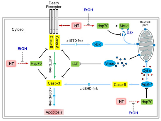 Ethanol enhances apoptotic cell death triggered by hyperthermia on human leukemia cells. Hyperthermia (HT) treatment alone stimulates apoptosis through a mechanism involving mainly caspase-8 and caspase-3 activities and increases the levels of the survival factor HSP70 which is able to: (i) stabilize the anti-apoptotic factor Mcl-1, (ii) to block Bax translocation and apoptosome formation (via binding to Apaf-1) and (iii) to inhibit caspase-8 and caspase-3. Ethanol abrogates hyperthermia-induced HSP70 expression, leading to an increase in caspase-8 activity, hydrolysis of Bid, translocation of Bax, release of mitochondrial factors (cytochrome c and Smac) and finally increase in caspase-9 and caspase-3 activities. Cyt c, cytochrome c; z-IETD-fmk, caspase-8 inhibitor, z-LEHD-fmk, caspase-9 inhibitor; z-DEVD-fmk, caspase-3 inhibitor; tBid, truncated Bid.