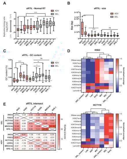 Genomic and epigenomic characteristics of aRTIL. Box and whiskers (min to max) representing (A) the normal replication timing (DMSO condition) (B) the size and (C) the GC content of ADV and DEL aRTIL in the six cell lines. Statistics: Kruskal–Wallis test with Dunn’s multiple comparison: **** p < 0.0001, ** p < 0.01, * p < 0.05, ns p > 0.05. (D) Heatmap of coverage and clustering trees based on Pearson correlations for epigenetic marks in K562 (top) and HCT116 (bottom) cell lines in different loci (Early, Mid, Late, ADV, DEL, ADV random, and DEL random). The coverage was normalized to have all values between 0 (blue) and 1 (red). (E) Heatmap of intersections between ADV and DEL aRTIL in between the six cell lines. Jaccard index was used to measure the intersection, and the z-score between Jaccard for aRTIL list and randomized regions is reported (see method section).