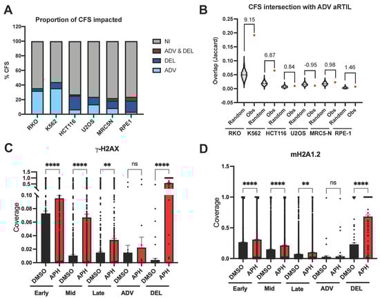 ADV aRTIL are closely related to CFS but are not enriched in DNA damage signaling histone marks. (A) Stacked histogram representing the proportion (in %) of CFS impacted by aphidicolin (ADV or DEL). (B) Jaccard index for overlap of CFS with observed ADV aRTIL (red) and randomly shuffled regions of equal size (gray). Values of z-score between random and observed Jaccard are indicated as statistics. Scatter plots with bar (SEM) representing the coverage of (C) γ-H2AX histone mark and (D) mH2A1.2 histone mark (ChIP-seq data for K562 cell line) on early, mid, late, ADV aRTIL, and DEL aRTIL genomic regions in DMSO (black) and APH (red). Statistics: Kruskal–Wallis with Dunn’s multiple comparison: **** p < 0.0001, ** p < 0.01, ns p > 0.05.