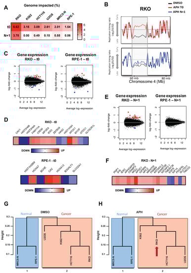 ADV aRTIL can be transmitted to daughter cells. (A) Heatmap representing the coverage (in %) of RT impacted genome in mother cells (t0) and released daughter cells (N + 1) for the six cell lines. (B) START-R snapshots of Loess-smooth replication timing profiles for the same region (Chromosome 4), in RKO mother (APH t0) and daughter cells (APH N + 1). The dark lines correspond to replication timing of control (DMSO), the red line is replication timing of t0 APH-treated cells, and the blue line is the replication timing of N + 1 daughter cells released from APH treatment. (C) Scatterplots for differential gene expression between DMSO and APH treatment from microarray data in RKO (left) and RPE-1 (right) mother cells (t0). Significantly APH UP genes are marked in red and APH DOWN genes are marked in blue. Statistics: ANOVA, Benjamini–Hochberg correction, FDR < 0.05. (D) Heatmaps with names and color scale based on log2 fold change for the significantly impacted genes in RKO (top) and RPE-1 (bottom) mother cells (t0), APH DOWN, in blue; APH UP, in red. (E) Scatterplots for differential gene expression between DMSO and APH treatment from microarray data in RKO (left) and RPE-1 (right) daughter cells (N + 1). Significantly APH UP genes are marked in red and APH DOWN genes are marked in blue. Statistics: ANOVA, Benjamini–Hochberg correction, FDR < 0.05. (F) Heatmap with names and color scale based on log2 fold change for the significantly impacted genes in RKO daughter cells (N + 1), APH DOWN, in blue; APH UP, in red. Statistics: ANOVA, Benjamini–Hochberg correction, FDR < 0.05. Cluster dendrograms aggregating cell lines based on replication timing patterns in (G) DMSO and (H) APH conditions. Distance: correlation and clustering method: average (see method).
