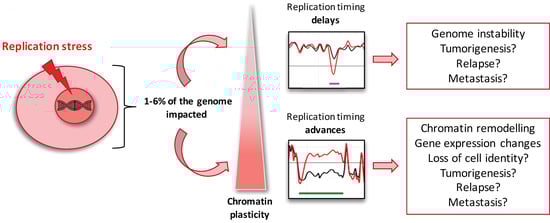 Model for the differential impact of low replication stress on replication timing. Scheme of the proposed response of cells to low replication stress depending on the level of chromatin plasticity. Replication stress would differentially impact the cells depending on their background. Cells with chromatin plasticity would have a higher proportion of RT advances under replication allowing DNA replication program modifications and the regulation of specific genes’ expression, potentially affecting cellular identity. Importantly, this work paves the way for future studies investigating molecular effectors involved in chromatin accessibility and replication timing changes in response to stress. These new targets could have a great potential to prevent cancer cells’ adaptation to replication stress, often leading to therapy resistance.