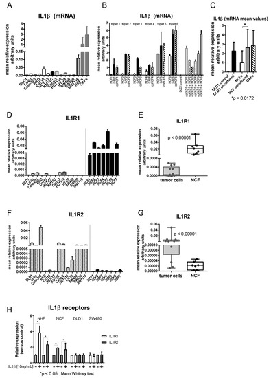 Regarding the expression of the IL1β receptors, IL1R1 and IL1R2, IL1R1 was strongly expressed in fibroblasts while colorectal tumor cell lines expressed extremely low levels of the receptor (Figure 1D,E). Interestingly, the decoy receptor IL1R2 was expressed at low levels in fibroblasts, while its expression in tumor cells was variable but high in most of the CCCL tested (Figure 1F,G).