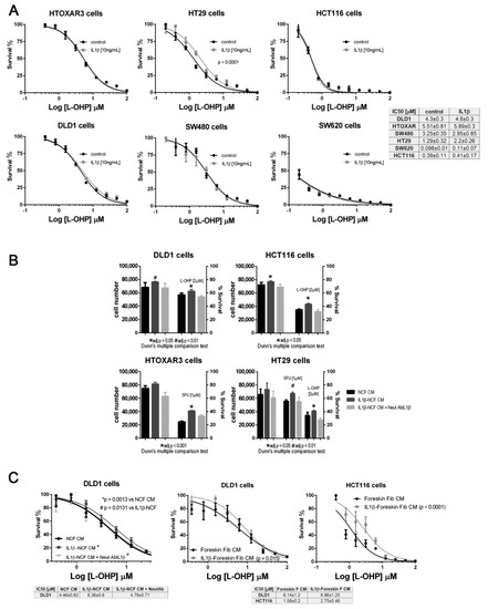 (A) Panel with dose–response curves for L-OHP of six colorectal cancer cell lines cultured under standard conditions (black lines) or in the presence of (10 ng/mL) IL1β (grey lines). IL1β displaced the IC50 values for L-OHP only in HT29 cells. Each dose–response curve corresponds to the mean of three independent experiments of six technical replicates each. Differences between mean (n = 3) dose–response curves were compared with extra sum-of-squares F test (Log IC50). Survival is reported as %. (B) Panel of four colorectal cell lines treated with conditioned medium (CM) from NCFs (black bars), IL1β-stimulated NCFs (dark grey bars), or IL1β-stimulated NCFs plus a neutralizing antibody against IL1β ((2 µg/mL); light grey bars). IL1β used at (10 ng/mL). For all cell lines tested, IL1β-stimulated NCFs CM promoted proliferation (left Y axis) of tumor cells, although the effect relative to control NCFs CM was only statistically significant in DLD1 and HCT116 cells. The right Y axis shows that, for all cell lines and drugs (L-OHP and 5FU), the viability of cells cultured with IL1β-stimulated NCFs CM was greater than that of controls (Kruskal–Wallis, Dunn’s multiple comparison test, adjusted P values), meaning that IL1β targets modified the sensitivity to both drugs. Such sensitivity was restored by the addition of a neutralizing IL1β antibody during NCF culture for CM production. Bars depicted mean + sd of four independent experiments of six technical replicates each. (C) The same observation as described in (B), in dose–response curves, where IL1β-stimulated (10 ng/mL). NCFs CM induced a shift in the IC50 curves for L-OHP, leading to an increase in tolerance of cytotoxic compounds (left plot). Similar results were obtained for DLD1 and HCT116 using foreskin fibroblasts (middle and right graphs). Survival is reported as %. In both cases, dose–response curves correspond to the mean of three independent experiments.