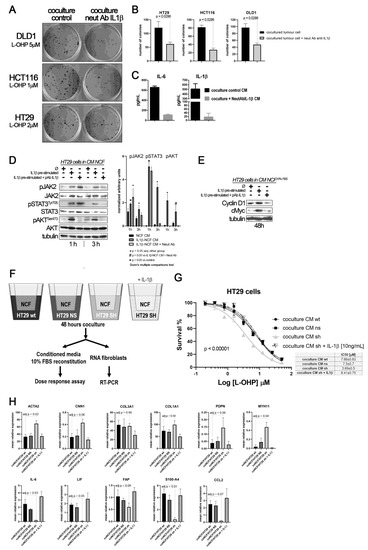 (A) colony forming assay of CCCL in transwell coculture with NCF. (B) quantification of colonies: Blocking the IL1β-mediated crosstalk between cocultures of NCF (upper 24 mm transwell chamber) and colorectal cancer cell lines (lower transwell chamber) with a neutralizing IL1β antibody sensitizes cancer cells to L-OHP. (C) Such IL1β blocking altered the composition of conditioned media (affecting IL1β targets), as illustrated in the bar graphs, where the neutralizing antibody affected the IL1β itself and IL6, as a surrogate marker of the IL1β response (grey bars), both soluble factors determined by ELISA in a mixture of coculture supernatants before 10% FBS reconstitution (proportional volume of the different CM from NCF with either DLD1, HT29, or HCT116 cells). (D) Western blot of HT29 cells cultured with control CM (Ø) or IL1β-stimulated NCF-conditioned medium (10 ng/mL of IL1β) or same condition with the addition of a polyclonal neutralizing antibody against IL1β (2 µg/mL). FBS-free DMEM/F12 was used to generate conditioned medium after 48 h NCFs culture with or without the presence of the neutralizing antibody. Such conditioned media were then used to stimulate JAK2, STAT3, or AKT in HT29 cells for 1 h or 3 h. Quantification of phosphoproteins for three independent experiments was performed normalizing first for total JAK2, STAT3, or AKT and then normalizing for Tubulin (data expressed as arbitrary units). Statistical significance was assessed using non-parametric Kruskal–Wallis + Dunn’s multiple comparison test. (E) In 48 h experiments, the same conditioned media were reconstituted at 10% FBS. We evaluated JAK/STAT target proteins, Cyclin D1, and cMyc. (F) Overview of the experiment: to confirm paracrine signaling mediated by tumor cell-derived IL1β, we cocultured NCFs and HT29 cells with a defective secretion of IL1β, (silenced by means of shRNA) or transfected with a mock vector or wild-type as controls (75 mm transwell inserts, 3µm pore-size). As a positive control, we added IL1β to cocultures with HT29-shIL1β and NCFs. Culture conditions were: 2 × 106 cells tumor cells in the lower chamber and fibroblasts in the upper chamber (106 cells) in FBS-free DMEMF12. After 48 h, we harvested the conditioned medium and reconstituted the 10% FBS. As illustrated in (G), the conditioned medium obtained from cocultured NCFs and IL1β-deficient tumor cells (Ht29shIL1β) yielded lower IC50 values in dose–response assays compared with the other experimental conditions tested (p < 0.0001; survival is reported as %). The conditioned media obtained from cocultures of NCF and HT29-shIL1β cells with the exogenous addition of IL1β restored the IC50 values of cocultured with HT29 wild-type cells. Each dose–response curve corresponds to the mean of three independent experiments of six technical replicates each. Differences between dose–response curves were compared with extra sum-of-squares F test (Log IC50). (H) Real-Time PCR of the aforementioned cocultured NCF’s reported that the inhibition of the IL1β-mediated crosstalk between HT29shIL1β cells and fibroblasts induced a myofibroblastic phenotype in NCFs, with increased expression of ACTA2, CNN1, PDPN, and MYH11, while inflammatory markers were diminished, evidenced by decrease in IL6, LIF, and CCL2 (Kruskal–Wallis test; adjusted P values after Dunn’s multiple comparison test).