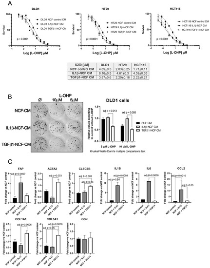 This fact, together with observations in Figure 2A,J let us to hypothesize that perhaps the population of inflammatory CAFs could be responsible of altering the chemosensitivity against cytotoxic drugs like L-OHP, while myofibroblastic CAFs might have other functions. To test this, we stimulated NCFs with (10 ng/mL) IL1β or (20 ng/mL) TGFβ1 for 48 h. With the conditioned media we performed a dose–response assay against L-OHP in CCCL. As illustrated in Figure 5A, only the IL1β-stimulated NCFs CM increased the L-OHP IC50 values (Fisher test; p < 0.0001), while the TGFβ1-stimulated NCFs CM did not differed from the NCF CM control, both in DLD1, HT29, and HCT116 cells. Similar results were observed in a colony forming assay, where IL1β-treated NCF conditioned medium significantly avoided the reduction of colonies induced by 5 µM and 10 µM L-OHP than TGFβ1-treated NCF conditioned medium (adj p = 0.013 and adj p = 0.005, respectively; Kruskal–Wallis test with Dunn’s correction for multiple comparison; Figure 5B).