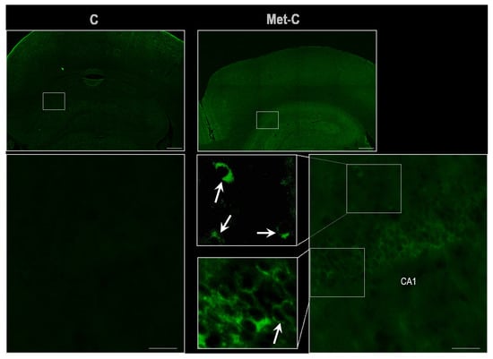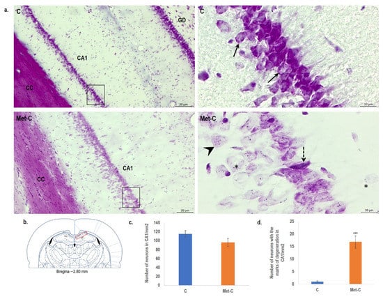 After 28 days of Met diet (at the 29th day), control and Met-C groups (n = 5/group) were placed in an anaesthetic box and put to sleep by spontaneous inhalation of 3.5% sevoflurane in a mixture of oxygen and nitrous oxide (33/66%). Animals were subsequently transcardially perfused with 0.1 mol/L phosphate-buffered saline (PBS, pH 7.4) followed by 4% paraformaldehyde in 0.1 mol/L PBS (pH 7.4) []. After perfusion, all animals were decapitated. The brains were removed from the skull and submerged overnight in the same fixative at 4 °C. Lastly, the rat brains were placed in 30% sucrose for the next 24 h at 4 °C. The rat brains were embedded with embedding medium (Killik, Bio Optica, Milano, Italy) and promptly frozen by a fast-cooling boost in a cryobar Shannon Cryotome E (Thermo Scientific, Waltham, MA, USA) and cut in 30 μm thick coronal slices, using the stereotaxic coordinates of the rat brain atlas of Paxinos and Watson [] as a reference. The coordinates (from Bregma) were approximately −2.80 mm to −3.80 mm. The sections were placed at Superfrost Plus glass (Thermo Scientific). Sections were afterwards dehydrated with ethanol in descending grades (100–70%; v/v), and then washed in distilled water. The sections were stained with 0.1% (w/v) cresyl violet and examined under the light microscope (Olympus BX41, Tokyo, Japan). The number of surviving neurons or neurons with marks of degeneration (shrink bodies or microvacuoles in the cytoplasm) in cornu ammonis 1 (CA1) of the hippocampus per 1 mm2 was counted as a neuronal density in the hippocampus.