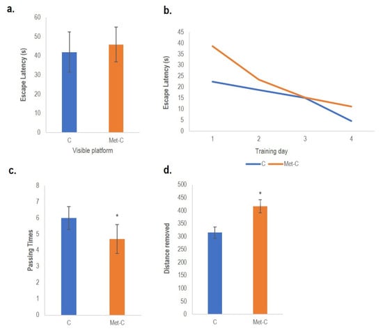 On the 6th day, the probe trial was conducted with a removed platform. The trial lasted 60 s. The analysis showed a decrease in counts passing over the hidden platform in Met-C group, but this descent was not statistically significant. On the other hand, distance swam in the target quadrant was statistically significant in Met-C group. The path length increased in 32.2% (470 ± 25; p < 0.05) when compared to the controls (Figure 3c,d).