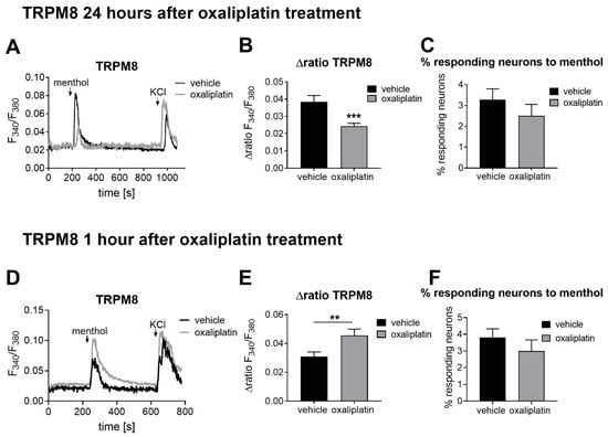 Previously, we showed that oxaliplatin induced mechanical hypersensitivity 24 h after treatment []. For the current study, we first investigated whether the activity of the TRPM8 channel was altered in response to oxaliplatin treatment. Using the TRPM8 specific agonist menthol (100 µM, 30 s), we observed that the TRPM8 channel activity was significantly reduced in oxaliplatin-treated animals after 24 h when compared with vehicle-treated animals (p = 0.0006, Figure 1A,B). Similar to the other investigated channels, the number of neurons responding to the selective TRPM8 agonist menthol was not affected (Figure 1C).