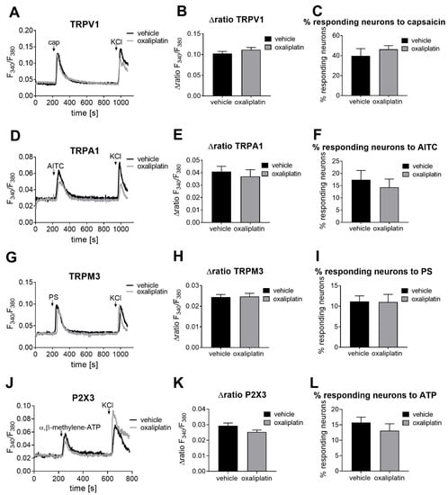 We next investigated the activity as well as the number of responding neurons of four additional ligand-gated calcium channels that have previously been suggested to contribute to persistent pain states and to hypersensitivity after oxaliplatin treatment (Figure 2). We first started to investigate the TRPV1 and the TRPA1 channel activity as well as the number of neurons responding to their agonists capsaicin (200 nM, 20 s) and AITC (allyl isocyanate; 100 µM, 30 s), as several studies described an involvement of both channels in the induction of oxaliplatin-induced acute peripheral pain [,,]. However, neither TRPV1 nor TRPA1 channel activity nor the number of responding neurons was affected 24 h after oxaliplatin treatment (Figure 2A–F). Viable neurons were identified by a short KCl stimulation at the end of each measurement, causing depolarization and activation of voltage-gated calcium channels. Previously, we could observe that the mRNA expressions of TRPV1 and TRPA1 were unchanged after oxaliplatin treatment []. We next investigated the mRNA expression levels of several other ion channels that have previously been connected with oxaliplatin-induced hypersensitivity []. For this experiment, DRGs were harvested from mice 24 h after oxaliplatin treatment (3 mg kg−1), and qPCR analysis was performed. However, we could not observe any alterations in mRNA expression levels for KCNK2, KCNK4, HCN1, piezo1 and P2X3 24 h after oxaliplatin treatment (Figure S1). Interestingly, the TRPM3 transcript was significantly increased in oxaliplatin-treated mice when compared with vehicle-treated animals after 24 h (p = 0.0348, Figure S1). We next investigated the activity of the TRPM3 channel but could not detect any differences in the activity and number of neurons responding to the TRPM3-specific agonist pregnenolone sulfate (PS, 40 µM, 45 s, Figure 2G–I) []. We additionally analyzed the activity of the nucleotide-gated P2X3 channel and the number of neurons responding to the P2X3-specific agonist α,β-methylene-ATP (50 µM, 20 s) [] because ATP-dysregulation after oxaliplatin treatment was described as a mechanism of oxaliplatin-induced pain by several studies [,]. However, when compared with vehicle-treated mice, no differences in Ca2+ influx in primary sensory neurons nor in the number of neurons responding to α,β-methylene-ATP could be detected after stimulating the P2X3 ion channel of oxaliplatin-treated animals (Figure 2J–L).