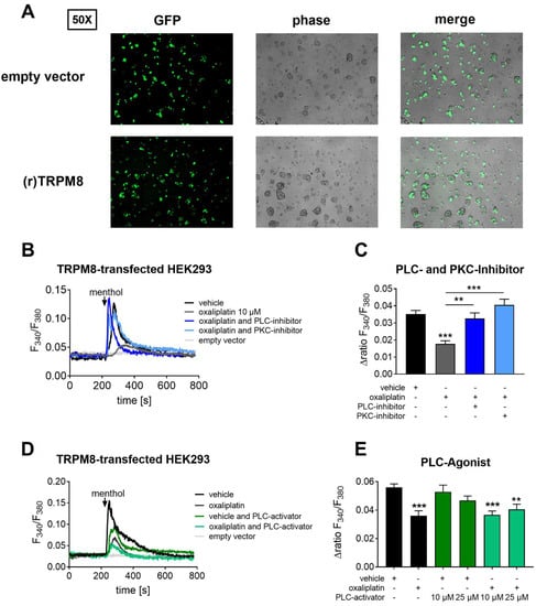 Transfected HEK cells show a decreased TRPM8 channel activity that can be reconstituted by PLC and PKC pathway inhibition. (A) Representative fluorescence and phase contrast images of TRPM8 and empty-vector (pEGFP)-transfected HEK cells captured at 50× magnification. (B) Representative Ca2+ responses after menthol stimulation (300 µM, 45 s) of TRPM8 (dark grey) and empty-vector-transfected (light grey) HEK cells that were treated with vehicle (0.052% v/v DMSO), 10 µM oxaliplatin (grey), ±1 µM of the PLC inhibitor U 73122 (blue), ±1 µM of the PKC inhibitor GF 109203X (light blue) for 24 h. (C) Δratio F340/F380 of the amplitude after a transient Ca2+ influx after stimulating TRPM8-transfected HEK cells. Data represent the means SEM from n = 44–152 cells per condition; ** p < 0.01; *** p < 0.001; one-way ANOVA and Dunnett´s post hoc test. (D) Representative Ca2+ responses after menthol stimulation (300 µM, 45 s) of TRPM8-transfected (dark grey) and empty-vector-transfected (light grey) HEK cells treated with vehicle (0.05% v/v DMSO), TRPM8-transfected HEK cells treated with 10 µM oxaliplatin (grey), 10 µM oxaliplatin ±10 µM (green) or 25 µM (light green) of the PLC activator m-3M3FBS for 24 h. (E) Δratio F340/F380 of the amplitude after a transient Ca2+ influx after stimulating TRPM8-transfected HEK cells. Data represent the means SEM from n = 62–160 TRPM8-transfected HEK cells per condition; ** p < 0.01; *** p < 0.001; one-way ANOVA and Dunnett´s post hoc test.