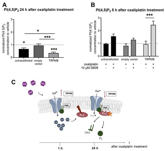 In the previous experiments, we observed that PLC pathway inhibition can reverse TRPM8 channel desensitization (Figure 3B,C). Since PLC activation leads to a depletion of its substrate PIP2, we next analyzed the PIP2 concentrations of untransfected, empty-vector-transfected and TRPM8-transfected HEK cells in the presence of oxaliplatin using a PIP2 ELISA. Comparing the relative PIP2 concentrations of vehicle- and oxaliplatin-treated HEK cells, we saw a significantly reduced PIP2 concentration, especially in TPM8-transfected HEK cells (p < 0.0001, Figure 4A). Interestingly, the relative PIP2 concentrations in TRPM8-transfected HEK cells were significantly decreased after oxaliplatin treatment in comparison with the empty-vector-transfected HEK cells and untransfected HEK cells (TRPM8-transfected HEK cells vs. empty-vector-transfected HEK cells after oxaliplatin treatment: p = 0.0001; TRPM8-transfected HEK cells vs. untransfected HEK cells after oxaliplatin treatment: p = 0.0499, Figure 4A). These results show that oxaliplatin can lead to PIP2 depletion.