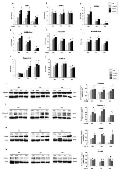 For several EMT markers, increased protein expression levels were obtained by WB analysis after TGF β1 treatment mainly at 72 and 96 h at the two highest concentrations (Figure 1 I–M). In addition, protein expression of VCAM1 significantly decreased at all TGF β1 doses following 72 and 96 h of treatment (Figure 1N).