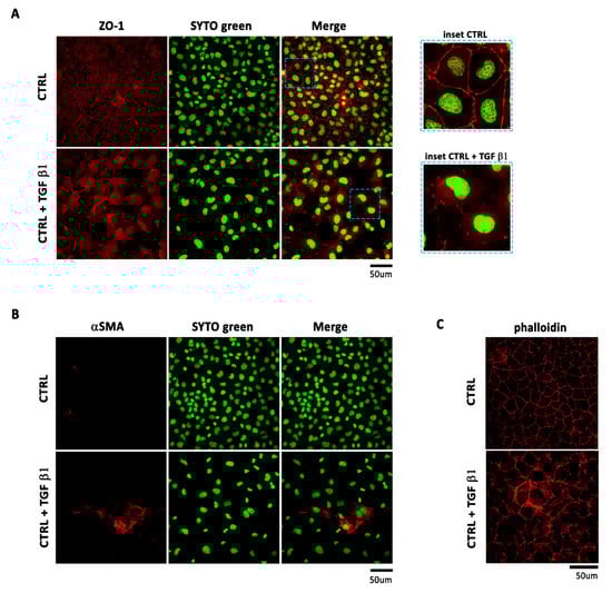 TGF β1 treatment induces loss of epithelial character and acquisition of mesenchymal character in EMCs. Non-confluent EMC cultures were stimulated with TGF β1 (1 ng/mL) and examined after 48 h by immunofluorescence for (A) the epithelial marker ZO-1 (inset: magnified version) and (B) the mesenchymal marker αSMA. Left panel: red fluorescence indicates ZO-1 or αSMA. Central panel: green fluorescence indicates SYTO Green Fluorescent staining of nuclei. Right panel: merge of both images. Scale Bar: 50 µm. After 48 h stimulation with TGF β1, (C) phalloidin visualized the increase in actin filaments.
