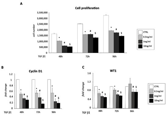 EMCs undergo EMT after exposure to TGF β1. Growth curve of EMCs after (A) 48 h, 72, and 96 h of culture and 0.5, 1, and 10 ng/mL of TGF β1 stimulation, compared to untreated conditions. Data represent means ± SEM of three Scheme 0. for 0.5 ng/mL of TGF β1; #, p < 0.05 for 1 ng/mL of TGF β1; §, p < 0.05 for 10 ng/mL of TGF β1 vs. control conditions (CTRL). mRNA expression levels of (B) Cyclin D1 and (C) WT1 in EMCs following exposure to 0.5, 1, and 10 ng/mL of TGF β1 for 48, 72, and 96 h, determined by real time PCR. The bar graphs show fold increases in expression of the studied genes in EMCs with respect to control untreated cells, set at 1. Data were normalized to GAPDH, a housekeeping gene, and represent means ± SEM of three separate experiments, each repeated in triplicate. *, p < 0.05 for 0.5 ng/mL of TGF β1; #, p < 0.05 for 1 ng/mL of TGF β1; §, p < 0.05 for 10 ng/mL of TGF β1 vs. control conditions (CTRL).