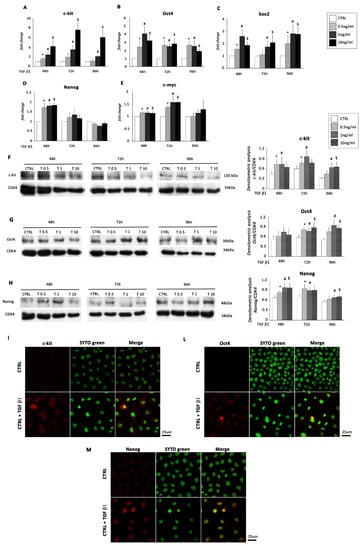 It has been demonstrated that EMT of cancer cells determines the formation of cancer stem cells with enhanced migratory capacity and invasiveness []. Epicardial EMT drives to the formation of progenitors []. Our group recently provided evidence of epicardial EMT-mediated formation of c-kit+ progenitor cells in vivo []. Accordingly, TGF β1 treatment of EMCs increased the expression of stem cell genes. Specifically, mRNA expression for c-kit, Oct4, and Sox2 significantly increased at all three time points (Figure 4A–C) and mainly at all doses, while Nanog expression strongly increased only at the earliest time point (Figure 4D) and c-myc expression levels significantly increased at 48 and 72 h (Figure 4E). Increased protein expression levels were obtained by WB analysis after TGF β1 stimulation at 48, 72, and 96 h for c-kit and Nanog (Figure 4F,H) and only at 72 and 96 h for Oct4 (Figure 4G). These results were also supported by immunofluorescence stainings (Figure 4I–M).