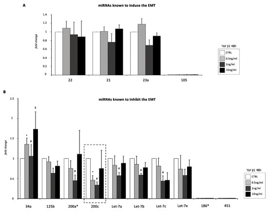 As an initial step toward identifying miRNAs that may be implicated in TGF β1-induced EMT of EMCs, we focused on the expression of several miRNAs mainly involved in epicardial EMT [,,], but also in the EMT of other cell types [] (Figure 5A,B).