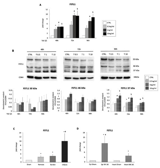 Further, previous results already demonstrated that FSTL1 induced EMT in the airways of patients and mice by activating autophagy, and miR-524-5p/FSTL1 has the ability of regulating the progression of EMT of breast cancer cells [,]. Similarly, in our study, using an in vivo model of myocardial infarction in mice, we detected a strong upregulation of FSTL1 in epicardial cells undergoing EMT during acute MI. In addition, treatment with TGF β1 induced in EMCs in vitro a significant enhancement in the mRNA and protein expression levels of FSTL1.