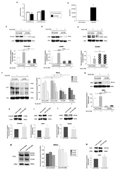 To investigate whether miR-200c inhibits EMT by targeting FSTL1, EMCs were infected either with a lentivirus encoding miR-200c or with a control virus (Figure 7B). Following infection, EMCs were treated with TGF β1 for 24 h. Stimulation of EMT by TGF β1 treatment was abrogated in EMCs by overexpression of miR-200c as demonstrated by the modulation of three EMT markers (Figure 7C–E). Specifically, the protein expression levels of Vimentin and αSMA (Figure 7C,D) were significantly inhibited, while that one of VCAM1 was strongly enhanced (Figure 7E). Importantly, overexpression of miR-200c induced a significant down-regulation of FSTL1 protein level in lenti-miR-200c transfected cells compared to control cells both in the absence and in the presence of TGF β1 treatment (Figure 7F). Again, the modulation was significant for FSTL1 37 kDa, but not for the other forms (Figure 7F). As expected, we also observed a significant protein down-modulation of ZEB1 in miR-200c overexpressing cells following TGF β1 treatment compared to control cells (Figure 7G).