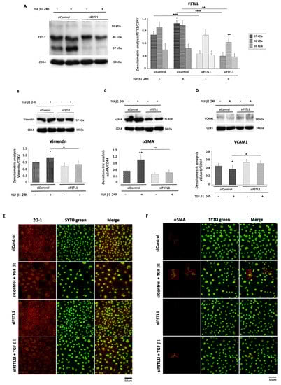 FSTL1 knockdown reverses EMT. EMC cells were transfected with control siRNA (siControl) or siRNA directed against FSTL1 (siFSTL1) and then treated or not with TGF β1 (1 ng/mL) for additional 24 h starting from the day after transfection. WB analysis performed with antibodies against (A) FSTL1, (B) Vimentin, (C) αSMA, and (D) VCAM1. CDK4 was used as loading control. Upper panel (or left panel for FSTL1): A representative Western blotting of three independent experiments is shown. Lower panel (or right panel for FSTL1): Densitometric analysis of Western blot. Data are shown as means ± SEM. *, p < 0.05 vs. siControl, **, p < 0.005 vs. siFSTL, two-tailed Student’s t-test; °, p < 0.05, °°, p < 0.005, °°°, p < 0.0007, °°°°, p < 0.0001, two-way ANOVA, Bonferroni post hoc test. (E,F) Representative images of EMCs immunostained for the epithelial marker ZO-1 and the mesenchymal marker αSMA, untreated and treated with TGF β1 (1 ng/mL) for 24 h and transfected with control siRNA (siControl) or siRNA directed against FSTL1 (siFSTL1). Left panel: red fluorescence indicates ZO-1 or αSMA. Central panel: green fluorescence indicates SYTO Green Fluorescent staining of nuclei. Right panel: merge of both images. Scale Bar: 50 µm.