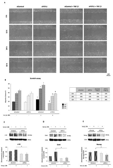 FSTL1 knockdown reverses EMT-associated and stem-like traits. (A) Representative images at 0, 12, 24, and 32 h after the scratch was made in EMCs transfected with siRNAs (siFSTL1 or siControl) for 72 h and treated or not with 1 ng/mL TGF β1 for additional 48 h starting from the day after transfection. Scale bar: 100 µm. (B) Quantification of migration distance, given as the percentage of wound healing calculated on the ratio between wound width at the observed time point and wound width at the 0 h time point (n = 3; *, p < 0.05 vs. siControl; #, p < 0.05 vs. siControl + TGF β1 48 h). (C–E) WB analysis performed with antibodies against (C) c-kit, (D) Oct4, and (E) Nanog. CDK4 was used as loading control. Upper panel: A representative Western blotting of three independent experiments is shown. Lower panel: Densitometric analysis of Western blot. Data are shown as means ± SEM. *, p < 0.05 vs. siControl, two-tailed Student’s t-test; °, p < 0.05, two-way ANOVA, Bonferroni post hoc test.