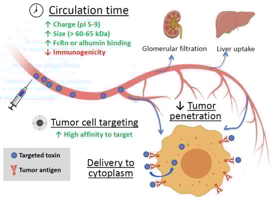 The main factors affecting the efficiency of targeted toxin. Green up arrows—factors enhancing circulation time and tumor cell targeting. Red down arrow—reducing factor. FcRn is the neonatal Fc receptor.