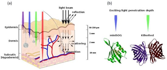 (a) Light propagation through the tissues; (b) Genetically encoded PSs. 3D model (ribbon representation) of miniSOG (PDB entry 6GPV) and KillerRed (PDB entry 2WIQ) was made using DS ViewerPro 5.0 software.