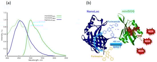 Bioluminescence system based on luciferase, furimazine, and miniSOG. (a) Normalized emission spectrum of furimamide (NanoLucem) and normalized absorption (miniSOGabs) and emission (miniSOGem) spectra of miniSOG. (b) Scheme of BRET-mediated system for deep PDT [,].