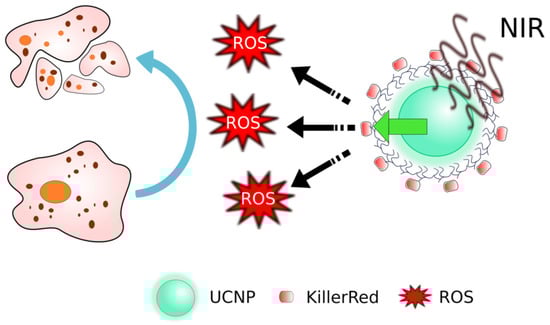 Another known to date genetically encoded PS capable of ROS production under exposure to visible light is KillerRed (Figure 3a). When irradiated with yellow-orange light (~582 nm), KillerRed demonstrated efficient production of ROS, the phototoxicity of which was at least 1000 times higher than that of other fluorescent chromoproteins [,]. To overcome the shallow penetration depth of excitation light and make possible to use KillerRed in deep-seated tumors, the photosensitizing bio-nanohybrids based on KillerRed and upconversion nanoparticls (UCNP) have been developed (Figure 5) []. UCNPs used in this work are able to convert deep-penetrating near infrared (NIR) light to yellow light to excite KillerRed locally. It was shown that being excited by UPNPs, KillerRed efficiently generates ROS that cause cancer cells killing. The KillerRed-UCNPs exhibit excellent colloidal stability in biological buffers and low cytotoxicity in the dark. Cross-comparison between the conventional KillerRed and UCNP-mediated KillerRed PDT demonstrated superiority of KillerRed-UCNPs photosensitizing by NIR irradiation, manifested by the fact that about 70% PDT efficacy was achieved at 1-cm tissue depth, whereas that of the conventional KillerRed dropped to about 7%. Bio-nanohybrids proposed in this work prompts investigation of phototoxic potential of proteins in the visible and even ultraviolet spectral ranges towards their potential utilization in PDT.