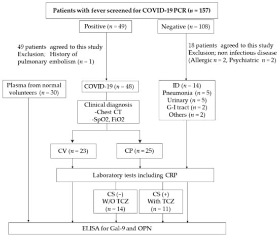 This was a cross-sectional analytical study, and patient samples were collected at SCH, Sendai, Japan, from July 2020 to October 2020. Among 4897 patients in the out-patient department, 157 febrile patients were screened by a SARS-CoV-2 PCR test using a sample obtained from a nasopharyngeal swab as previously described []. Among 49 positive cases, one patient who had been suffering from pulmonary embolism was excluded. Among 108 negative cases, informed consent was obtained from 18 cases, and 14 patients who were clinically suspected of bacterial infection were enrolled (Figure 1). Of the 23 CV patients, 12 were hospitalized and the remaining 11 were outpatients.