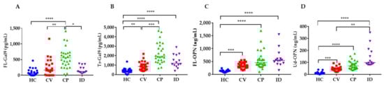 OPN levels were significantly higher in COVID-19-infected severe patients compared with non-severe cases []. Gal-9 levels were elevated in subjects infected with COVID-19 [,] or dengue febrile illness and reflected the severity of the disease []. We investigated these proteins because OPN protects macrophages from apoptosis [] and enhances Th1-mediated inflammatory responses [], whereas Gal-9 induces apoptosis []. Very recently, Gal-9 induces autophagy by activating AMP-activated protein kinase (AMPK) []. Our results are novel because we measured the FL and cleaved forms of the products. ROC analysis demonstrated that FL-OPN and Ud-OPN had higher AUC values in the CV group compared with the HC group. In the CP group, Ud-OPN (1.00) had the highest AUC value followed by Tr-Gal9 (0.99), indicating that the cleaved forms were more specific in CP patients. Notably, FL- and Ud-OPN had the highest AUC values (1.00) in the ID group.
