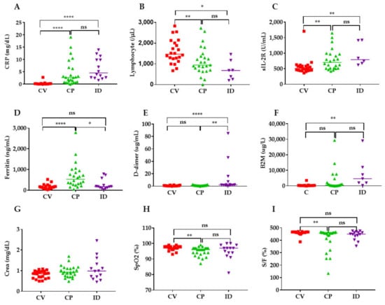 The levels of CRP, sIL-2R, and ferritin in the CP group were significantly increased compared with those in the CV group (Figure 3A,C,D). Similarly, the levels of percutaneous oxygen saturation (SpO2), the SpO2 fraction of inspiratory oxygen (FiO2) (S/F) ratio, and the numbers of lymphocytes were significantly lower in the CP group compared with the CV group (Figure 3B,H,I). The levels of CRP, sIL-2R, d-dimer, and B2M in the ID were significantly increased compared with the CV group (Figure 3A,C,E,F).