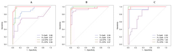 ROC analysis of Gal-9 (FL-Gal9 and Tr-Gal9) and OPN (FL-OPN and Ud-OPN) between the HC and CV groups (A), the CP group (B) and the ID group (C).