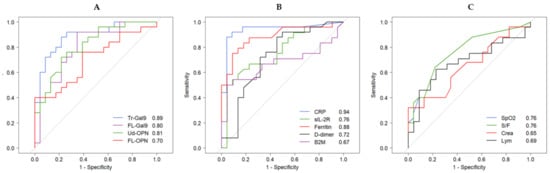 It is important to detect the development of pneumonia; therefore, ROC analysis was performed between the CV and CP groups and we compared Gal-9 and OPN levels with inflammatory, coagulation, and kidney indicators commonly used in clinical practice (Figure 2). The AUC of Gal-9 and OPN showed that Tr-Gal9 had the highest value (0.89), followed by Ud-OPN (0.81), FL-Gal9 (0.80), and FL-OPN (0.70) (Figure 5A). The ROC curve of other inflammatory markers showed that CRP had the highest AUC value (0.94), followed by ferritin (0.88), and sIL-2R (0.76) (Figure 5B). The SpO2 and SpO2/FiO2 values were 0.76 and the creatinine and lymphocytes values were below 0.70 (Figure 5C).