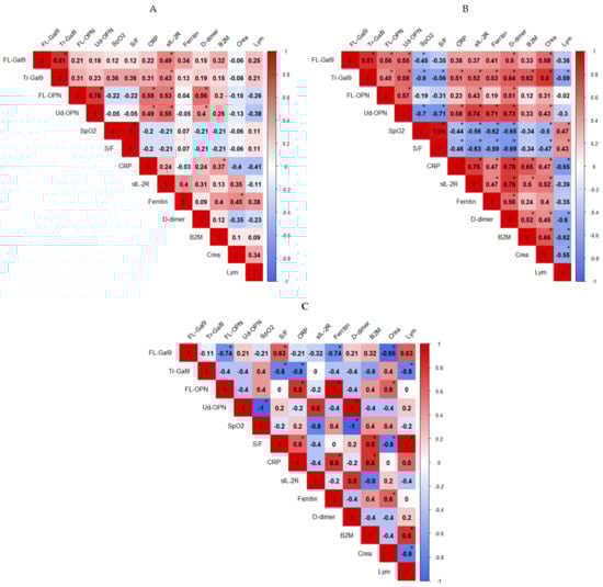 To understand the relevance of the elevated levels of Gal-9 and OPN in three groups, they were compared with inflammatory and respiratory markers. In the CV group, FL-Gal9 and FL-OPN were not significantly associated. A moderate association of FL-Gal9, Tr-Gal9, FL-OPN, and Ud-OPN with sIL-2R was found (Figure 6A). CRP levels showed a moderate association with FL- and Ud-OPN. In CP patients, FL-Gal9 was associated with Tr-Gal9 (Figure 6B). FL-Gal9 and FL-OPN were not associated with any other inflammatory markers. However, Ud-OPN and Tr-Gal9 had a moderate association with CRP, sIL-2R, ferritin and d-dimer. Tr-Gal9 also showed a high and moderate correlation with creatinine and B2M, respectively. However, these levels were not associated with blood urea nitrogen (data not shown). Ud-OPN and Tr-Gal9 had a moderate negative correlation with SpO2 and S/F ratio. A weak negative association between CRP and SpO2 with S/F ratio and a moderate positive association between CRP levels with sIL-2R and d-dimer was found.