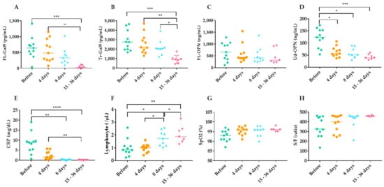 Effects of TCZ therapy on markers. Only those with data are shown in the figure. FL--Gal9 (A), Tr-Gal9 (B), FL-OPN (C), Ud-OPN (D), CRP (E), Lymphocyte (F), SpO2 (G), S/F ratio (H). TCZ; tocilizumab, **** p < 0.0001, *** p < 0.001, ** p < 0.01, * p < 0.05.