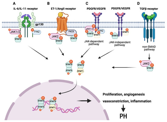 The different activators of JAK/STAT that play an important role in the pathophysiology of PH. (A) The binding of the cytokine (IL-6 or IL-11) to its unique receptor (IL-6R or IL-11R) triggers the homodimerization of GP130. This results in the phosphorylation of JAK1, JAK2, and Tyk2, which phosphorylate intracellular tyrosine residues that serve as docking sites for STAT3 in PH. (B) ET1 and Ang II exert their action through the activation of receptors that belong to a large family of transmembrane guanine nucleotide-binding protein-coupled receptors (GPCRs). JAK and STAT are constitutively expressed and directly coupled to this receptor. The binding of ETI/Ang II induces the phosphorylation of tyrosine in the JAK2 kinases, which in turn activates STAT1 and STAT3. In addition, ET-1 can stimulate the activity of PKC δ, which phosphorylates STAT3. (C) VEGFR and PDGFR are tyrosine kinase receptors. Ligand binding induces receptor dimerization (homo- or heterodimers) and the activation of the kinase domain. The activation of STAT1 and STAT3 can be mediated by JAK or TYK2 (the JAK-dependent pathway) or through the intrinsic tyrosine kinase activity of growth factor receptors (the JAK-independent pathway). (D) Stimulation with TGFβ induces the phosphorylation of JAK2 and thereby activates STAT3, but the exact mechanism is still unknown. Activated STAT1 and STAT3 translocate to the nucleus, where they bind to cis-inducing elements and promote the transcription of early growth response genes, which leads to proliferation, angiogenesis, vasoconstriction, inflammation, and resistance to apoptosis, triggering PH. Abbreviations: Ang II: angiotensin II; ET1: endothelin 1; IL-6: interleukin 6; IL-11: interleukin 11; JAK: Janus kinase; PDGF: platelet-derived growth factor; PKC δ: protein kinase Cδ; STAT3: signal transducer and activator of transcription 3; TGFβ: transforming growth factor-beta; VEGF: vascular endothelial growth factor. Created with BioRender.