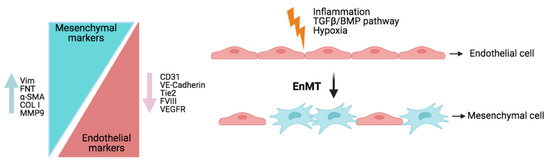 - Suzuki, T.; Carrier, E.J.; Talati, M.H.; Rathinasabapathy, A.; Chen, X.; Nishimura, R.; Tada, Y.; Tatsumi, K.; West, J. Isolation and characterization of endothelial-to-mesenchymal transition cells in pulmonary arterial hypertension. Am. J. Physiol. Lung Cell. Mol. Physiol. 2018, 314, L118–L126. [Google Scholar] [CrossRef]