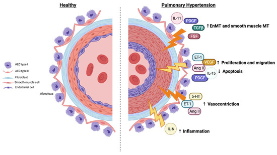 Cellular and molecular processes in pulmonary hypertension. PH is characterized by abnormal pulmonary artery remodeling, excessive pulmonary vasoconstriction, and processes that usually affect all vessel layers (intima, media, and adventitia), resulting in the loss of vascular cross-sectional area and, therefore, elevated pulmonary vascular resistance. The intimal changes include endothelial injury, endothelial and muscular cell proliferation, and the invasion of the intima by myofibroblasts, with enhanced matrix deposition and intimal fibrosis. These structural changes suggest a switch from a quiescent state to a proliferative, apoptosis-resistant cellular phenotype. These structural changes are triggered by the dysregulation of the expression and release of cytokines, growth factors, and vascular contractile agonists such as ET1 or Ang II. Abbreviations: AEC: alveolar epithelial cells; Ang II: angiotensin II; ET-1: endothelin 1; FGF: fibroblast growth factor; IL: interleukin; PDGF: platelet-derived growth factor; TGFβ: transforming growth factor-β; VEGF: vascular endothelial growth factor; 5-HT: serotonin. Created with BioRender.