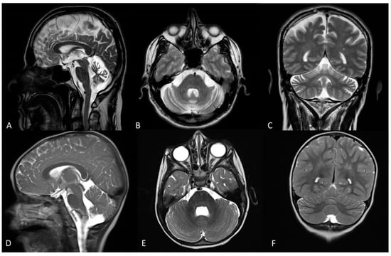 Brain MRI of patient 1 performed at 57 years old. T1-weighted midsagittal (A) axial (B) and coronal (C) sections showing atrophy of the cerebellar vermis and hemispheres. Brain MRI of patient 2 performed at age 2 years. T1-weighted midsagittal (D) axial (E) and coronal (F) sections showing mild atrophy of the superior cerebellar vermis and hemispheres.